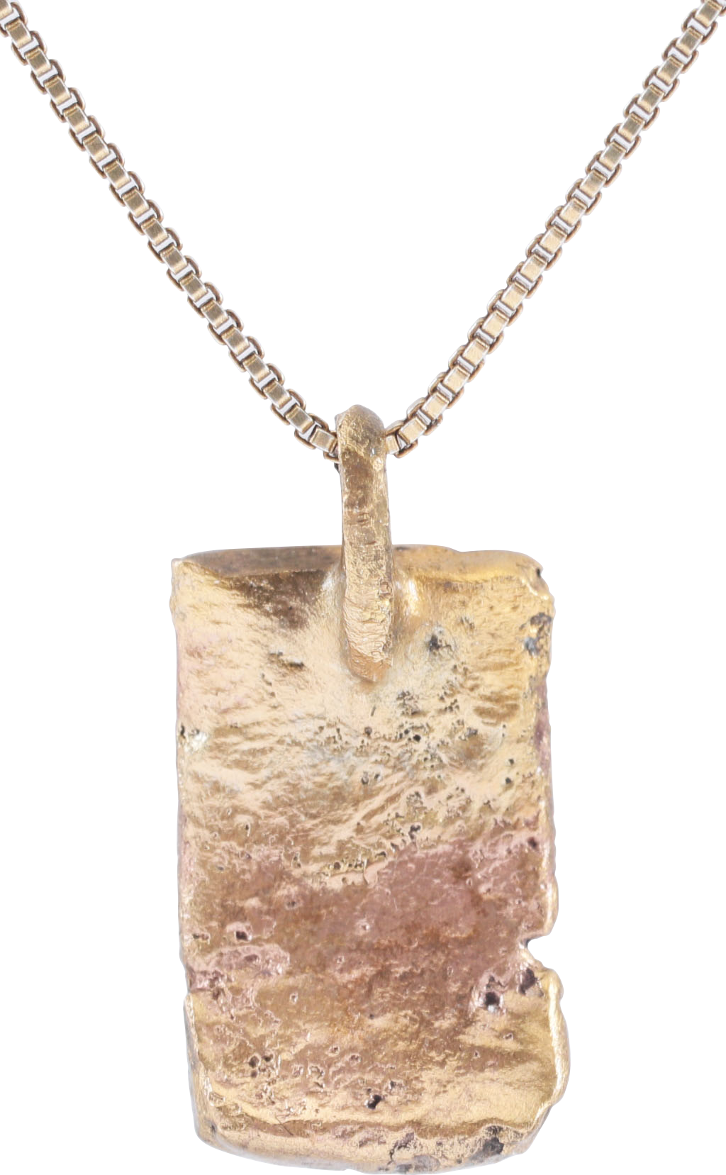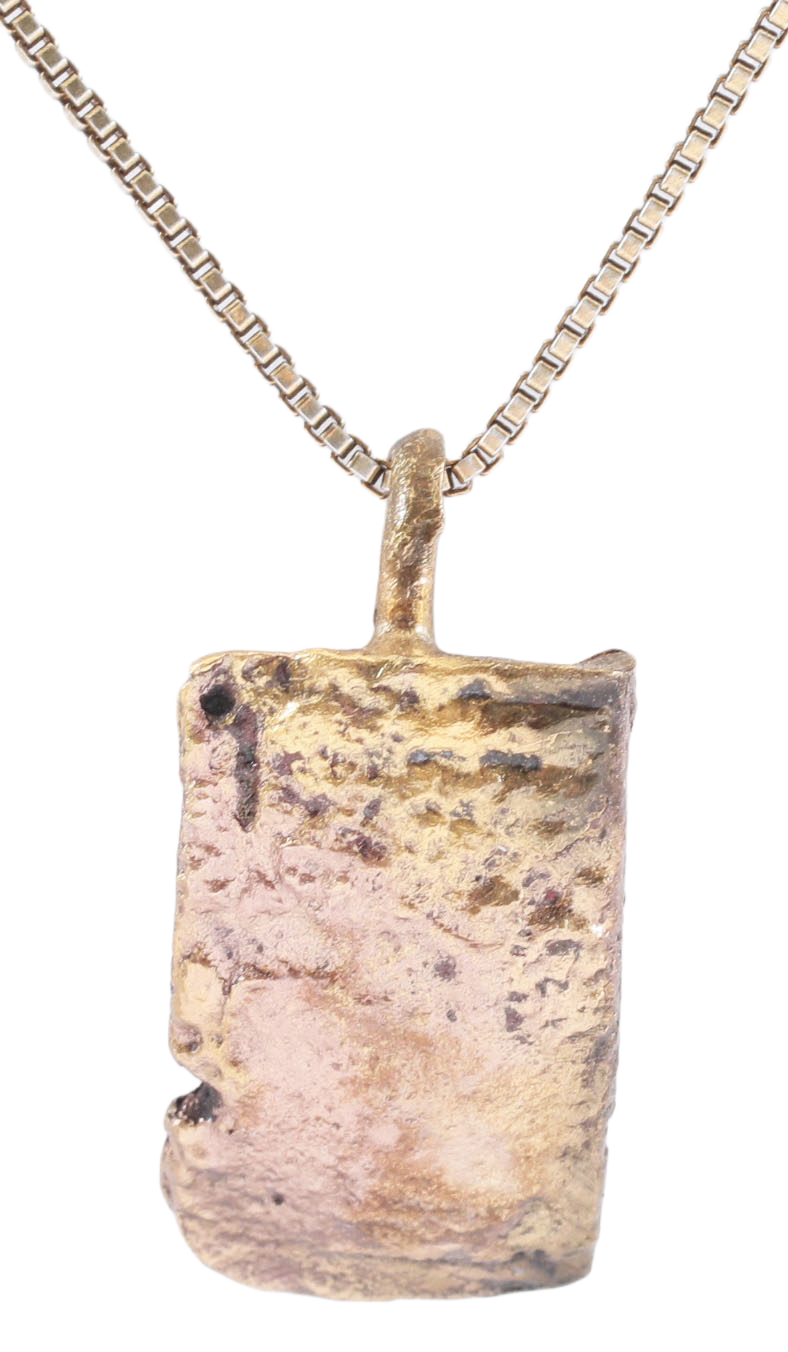 10th-11th century AD. For Vikings, breaking metal had supernatural significance. Breaking ringjarn (iron rings) as shown on the Larbro Stone, was thought to destroy the spirits of enemies. Viking weapons and accouterments were broken for burial with their owners. This is the broken end of a Viking woman warrior's bronze bracelet. It is about 3/8” x 5/8” (0.42” X 0.69”) relief decorated in transverse patterning. The surface is heavily textured from burial.  It was handcrafted by a Viking artisan 1000 years ago! It has been professionally refurbished with the 24karat gold overlay restored and mounted to an 18” gilt Sterling silver neck chain for modern wear. It comes with certification of authenticity, and gift boxed.